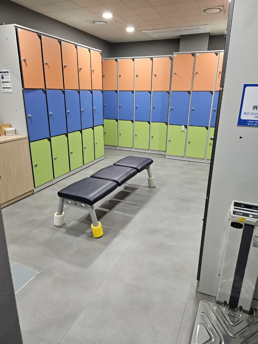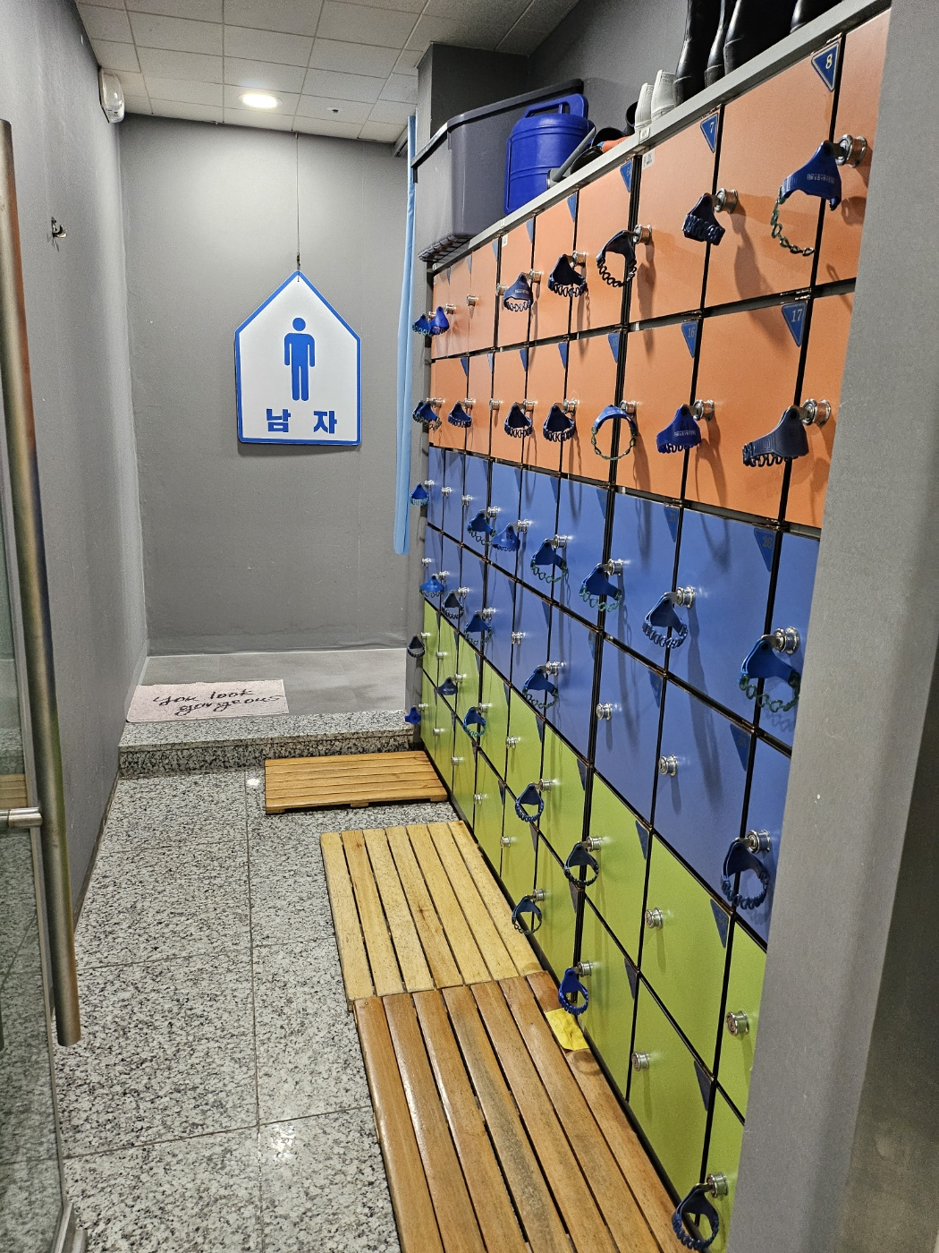 남자 탈의실 입구와 내부 모습입니다. 마침 아무도 없어서 한컷 할 수 있었습니다. 보시는 대로 넓은 형태는 아니고 딱! 저만큼의 케비넷만 있습니다. 위에서 말씀드린 드라이기 2대와 선풍기!! 수용인원이 많지 않으니 확인해 주세요!!!