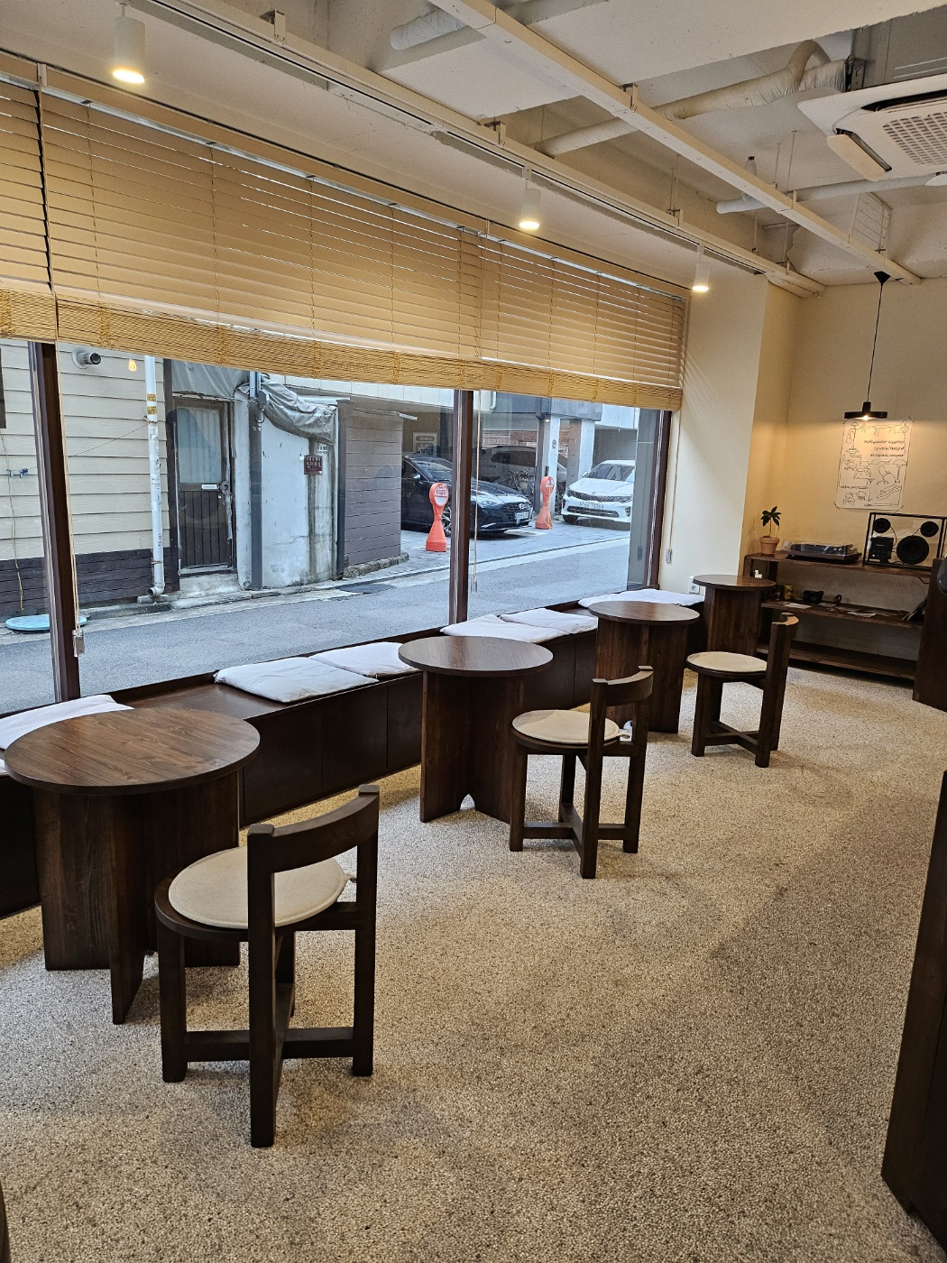 홀 내부 모습입니다. 유니크한 디자인이기는 하나 개인적으로는 좀 불편한 의자와 테이블이었습니다. 테이블이 좀 협소한 편이고 나무 의자라서 편안한 좌석은 아닙니다. 홀 이용 시 참고하시면 될 거 같습니다.