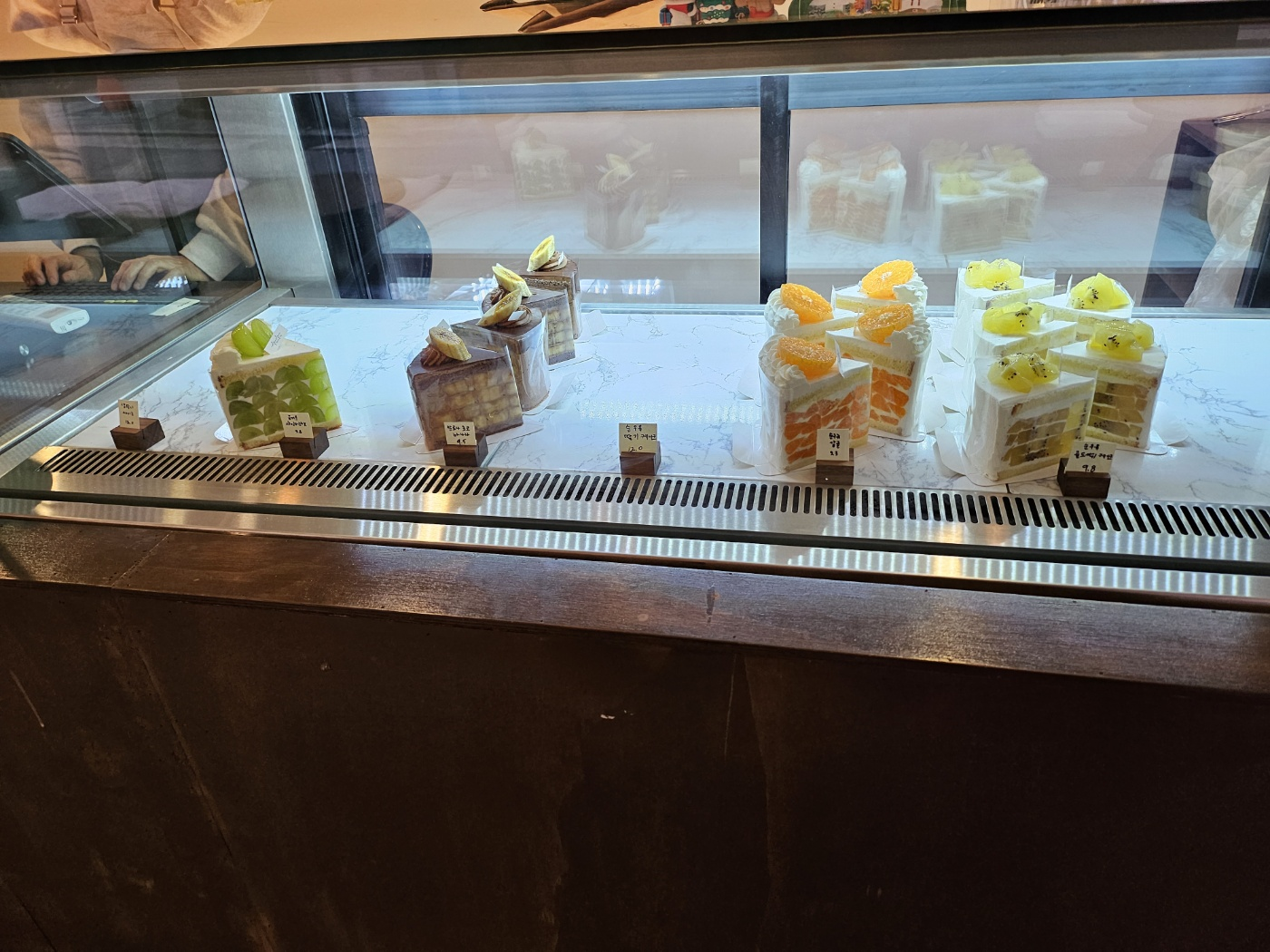 입구로 들어가면 제일처음 케이크 외에 다른 디저트들이 반겨줍니다. 먹음직스럽게 전시되어있네요!! 그리고 안쪽으로 들어가면 주력 상품인 케이크들이 전시되어 있습니다. 정말 육안으로 보더라도 과일이 엄청나게 많이 들어간 케이크입니다. 이 정도면 케이크에 과일을 넣은 게 아니라 과일에 약간의 빵과 생크림을 첨가한 느낌입니다. 저는 오늘 샤인머스켓과 감귤케이크 크리고 아이스아메리카노를 구매했습니다!