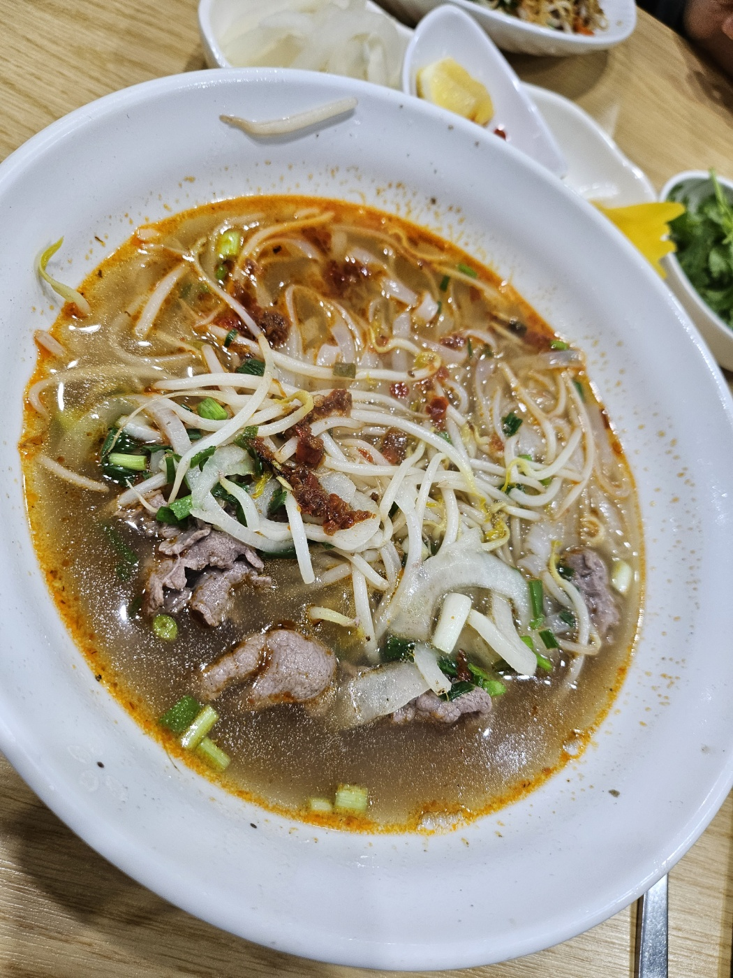 일반 쌀국수 육수도 일반 다른 쌀국수 집보다 깊은 국물 맛이 납니다. 좀 더 간이 강한면도 없지 않지만 그래도 구미가 당기는 맛입니다. 매운 쌀국수는 일반 쌀국수에 매운 양념을 첨가한 맛인 거 같습니다. 약간 고추기름 같은 느낌의 양념이 추가되는 듯합니다. 맵기는 신라면보다 약간 더 매운맛으로 입술이 조금 얼얼한 맛(?) 정도라 하겠습니다. 제가 매운걸 잘 못 먹는 편이지만 다 먹을 수 있었습니다. 가운데 사진이 제가 추천드렸던 베트남라면 소고기 볶음면입니다. 시중에 파는 라면 면발보다는 조금 얇은 거 같고요. 꼬들꼬들한 식감입니다. 각종 야채와 곁들여 먹을 수 있는 소스가 함께 나오고요. 이 집은 고수도 추가로 제공해 주시는데 고수 좋아하시는 분들은 고수향을 충분히 느끼시며 식사하실 수 있으실 거 같습니다.