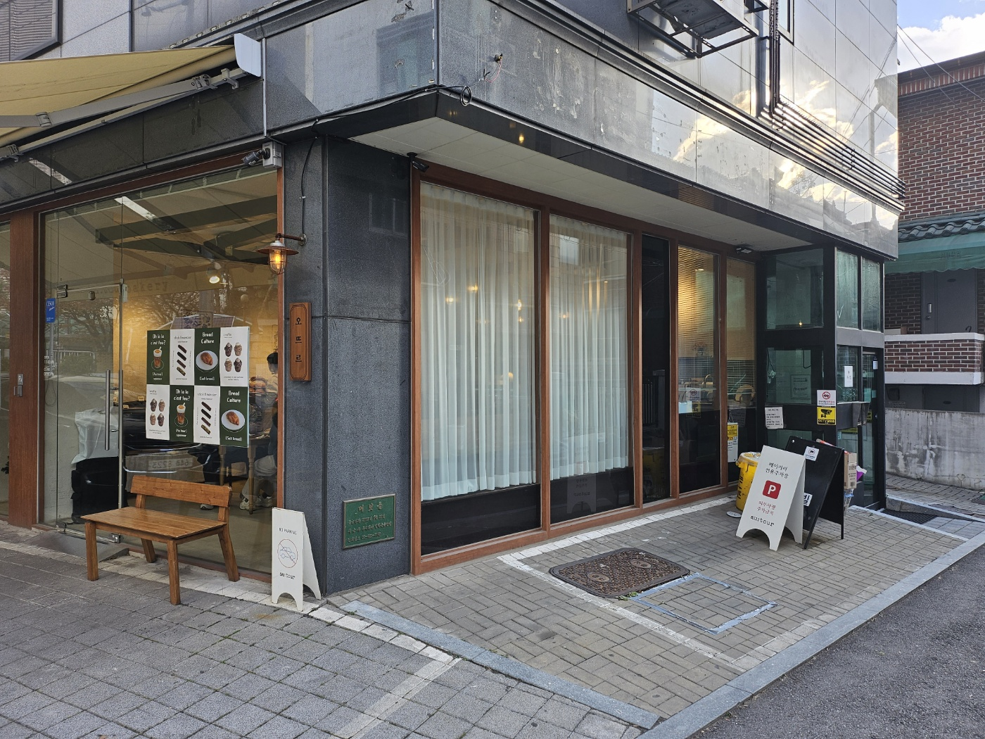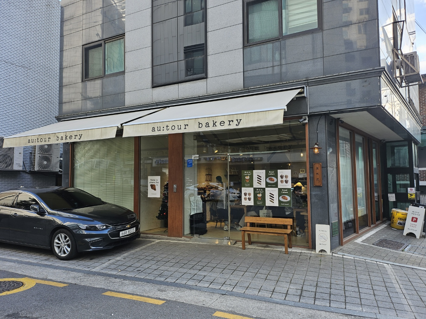오뜨르베이커리 외관입니다. 주차는 보시다시피 맥시멈 3대? 근데 1군데는 입구쪽이라 2대? 정도 가능하다고 보시면 되겠습니다. 그래도 위치가 천호동 번화가 근처라 걸어서 방문하시는 분들이 많으십니다!! 차 가지고 오셔서 후다닥 포장하고 가시는 분들도 많으세요! 천호 롯데시네마 근처에 위치해 있어서 접근성은 좋은 편이라 하겠습니다. 밖에 편하게 기다리시라고 의자도 준비되어 있는 거 같습니다. 제가 오늘 방문할 때만 하더라도 홀이 가득 차 있기는 했습니다. 홀이 넓은 편은 아니라서 조금 기다려야 하실 수도 있겠네요!