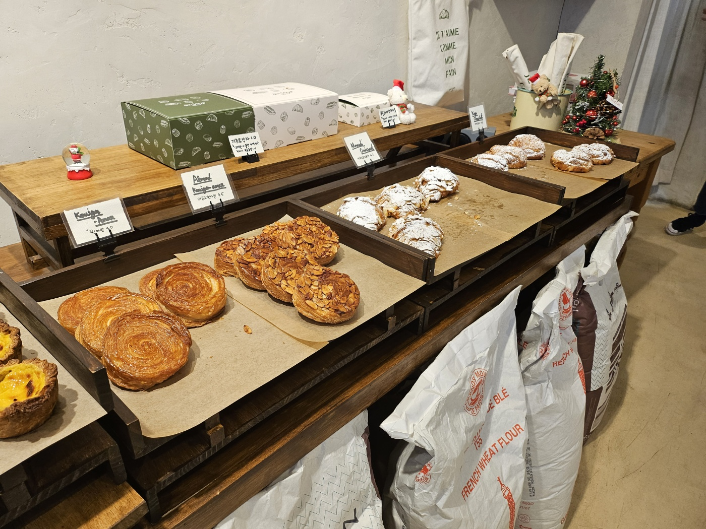 들어가시면 바로 왼쪽에 빵이 진열되어 있습니다. 잠시 빵 한번 감상하시고..... 아주 운이 좋았던지 방문하자마자 소금빵이 구워져서 나왔습니다. 저 탱글탱글한 소금빵 보이시나요? 이 집은 소금빵 외에도 피낭시에, 슈페너, 크러핀 등 카페를 대표하는 메뉴들이 많습니다. (제 여자친구는 에그타르트를 매우 좋아하더라고요) 역시 베이커리카페라 빵 맛집이네요!! 빵만 후다닥 포장해서 가시는 분들이 많은 이유가 있었습니다. 언급하지 않은 빵들도 많이 있습니다. 크루아상이라던지 쇼콜라라던지... 사진에 맛있음이 다 묻어나지 않은 거 같아서 살짝 아쉽습니다.