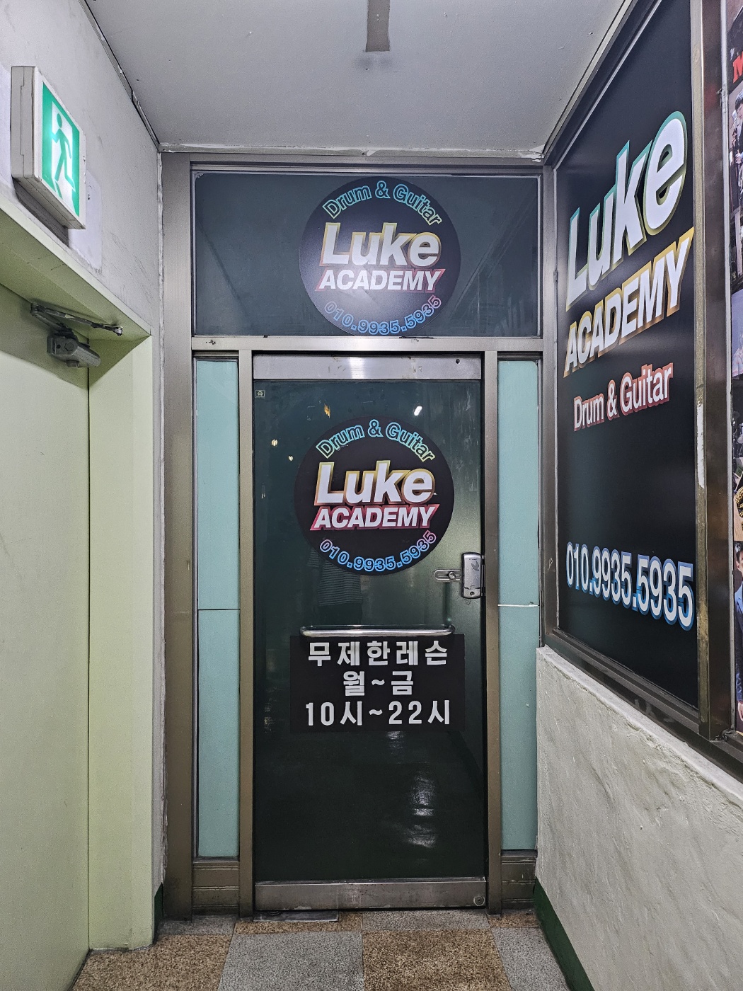 드럼과 기타를 모두 배울 수 있는 루크아카데미 입니다. 문에 적혀있는 거처럼 주 1회 레슨 이런 형태가 아닌 드럼 선생님들이 항시 상주하시며 그때그때 코칭해 주시고 피드백해주시는 시스템입니다. 연습은 24시간 언제든지 가능하시고요!! 선생님들이 계시는 시간은 14~22시까지 8시간 동안 계시네요!!