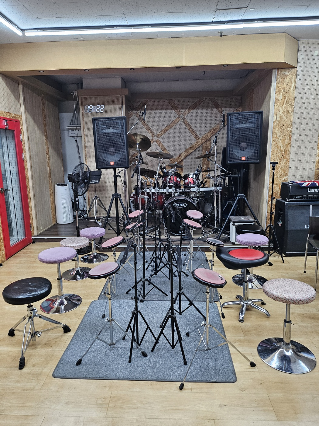 이곳은 드럼부스인데요. 이런 연습실이 10군데 있습니다! 여름에도 시원하게 연습하실 수 있도록 방마다 냉방시설과 선풍기가 준비되어 있고요! 믹서와 스피커가 방마다 있어서 본인이 연주하고 싶은 곡들을 틀어놓고 얼마든지 연습을 하실 수 있는 공간입니다. 연습하시다 보면 1시간 반이 훌쩍 지나가네요.